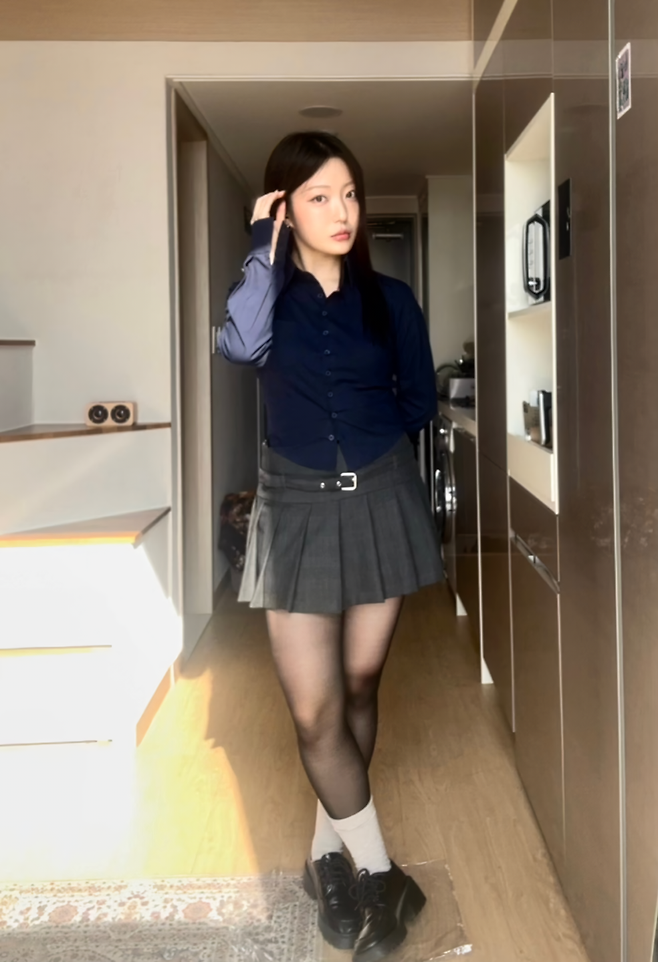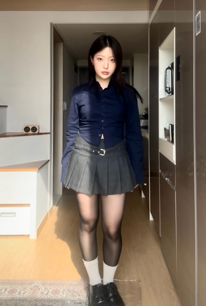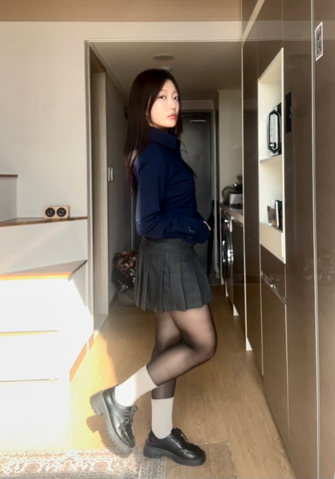 아까 두 번째 코디에서 입었던 스커트에 슬림하게 떨어지는 남색 셔츠 매치해줬어
