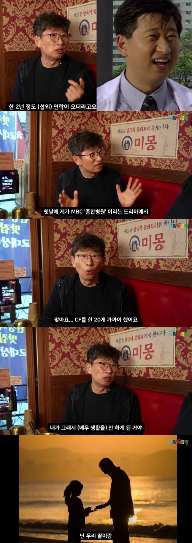 갑작스러운 방송 활동 중단에 대해서도 입을 열었다. 한창 촬영 중이던 시기, 식당에서 우는 아이를 보고 문득 자녀가 떠올랐고, 그날 아내에게 “이 일을 그만하겠다”고 말한 뒤 바로 연예계를 떠났다고 전했다.