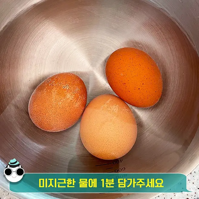 1) 냉장실에 두었던 반숙란을 꺼내 따뜻한 물에 1분 담가두세요. 물은 너무 뜨거울 필요는 없어요.저는 정수기에서 온수 120ml 냉수 240ml 섞은 물에 담갔답니다.