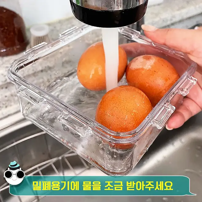 마지막은, 완숙란을 완큐에 왕창 까는 팁이에요. 반숙란은 흰자가 약해서 이 방법으로 까면 다 터진다는 거 주의! 오직 완숙란에만 사용해주세요! 이번에도 준비물은 밀폐용기 하나입니다. ㅋㅋ simple is best!