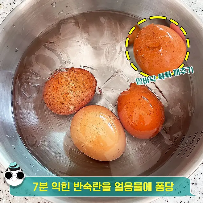 2) 다음 STEP은 얼음물이 담긴 볼에 계란 투척. 이때 껍질을 한 두 번 탁탁 쳐서 금이 살짝 가게 해준 후 넣는 게 뽀인트입니다!