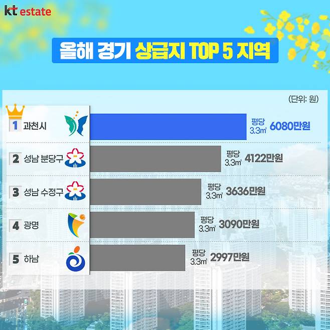 그렇다면 올해 경기권 상급지 TOP 5 지역은 어디일까요? 땅집고가 지난 4월 올해 1월부터 4월까지 국토교통부 실거래가 시스템 등록 거래 기반으로 3.3㎡당 평균 가격 기준으로 경기도 상급지 상위 5곳을 선정했는데요. 1위는 과천시로, 3.3㎡당 평균 아파트 가격이 무려 6080만원으로 나타났습니다. 이는 4월 기준으로 성동구의 5998만원보다 높은 수준입니다(출처: KB부동산).