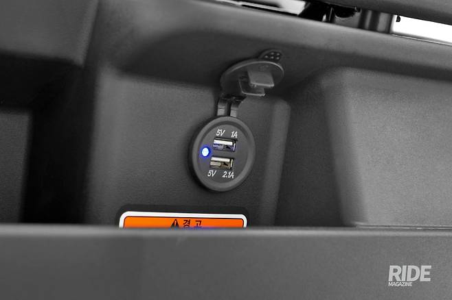 트렁크 이외에도 전면 개방형 글러브 박스가 있어 간단한 소지품들을 수납할 수 있다. 스쿠터를 타다보면 스마트폰 또는 헬멧용 블루투스 리시버 등 다양한 전자기기들을 충전해야 하는데 GS100에는 이를 위한 충전용 USB단자가 마련되어 있다. 왼쪽 글러브박스에 자리하고 있는 USB단자는 5V 2.1A, 5V 1A 2구로, 동시에 두 개의 전자기기를 충전할 수 있으며 평소에는 방수커버로 덮어 눈이나 비로부터 보호할 수 있다.