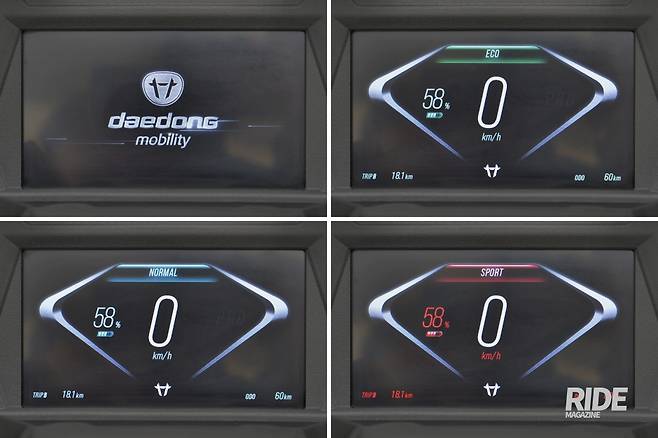 각 주행모드는 모터의 출력을 제어하는 것으로 각 상황에 맞춰 최대 출력을 조절할 수 있다. 모드별 최고 속도는 에코 70km/h, 노멀 80km/h, 스포츠 90km/h이며 출력 값으로 이야기하면 각각 10%가량의 차이를 보인다. 주행거리를 최대한 늘리기 위해서는 에코, 일반적인 도로 상황에서는 노멀, 주행 중 추월이나 빠른 속도를 필요로 할 때에는 스포츠 모드로 변경해가며 사용하면 된다. 모드 변경은 핸들 왼쪽에 위치한 모드버튼을 누르면 된다. 모드 변경 시 차량 디스플레이에 색상 변화와 글씨를 통해 현재 모드를 표시해준다.