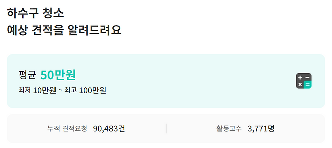 숨고 내에서 거래되는 하수구 청소 평균 비용은 건당 50만 원이에요. 최저 비용은 10만 원, 최고 비용은 100만 원으로 책정되어 있어요.