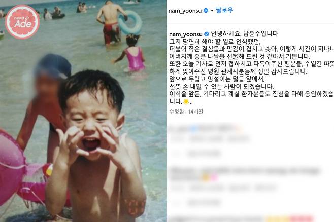 그러면서 “이식 수술을 준비하는 과정부터 수술을 마치고 회복해 퇴원하는 순간까지 늘 밝고 긍정적인 모습을 보여준 배우 남윤수 님. 그의 환한 웃음과 가족을 깊이 생각하는 선한 마음이 오늘의 좋은 결과를 가져오지 않았나 싶다”라고 덧붙여 훈훈함을 자아냈죠.