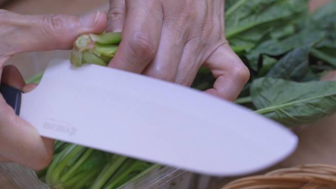 싱싱한 시금치를 사 온 후 밑단부터 정리해 주세요. 밑부분을 조금 잘라내어 한 군데 모아주면 된답니다.