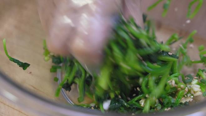 데쳐낸 시금치는 바로 찬물에 3번 정도 깨끗이 헹궈 주세요. 그리고 물기를 짜주면 끝! 만약 물기를 너무 짜지 않으면 양념장이 겉돌 수 있어요. 그래서 적당히 물기가 없을 정도로 물기를 짜주면 된답니다.