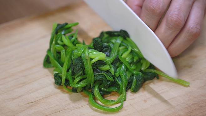 데칠 때 한 가지 팁은 조금 더 두툼한 줄기 부분부터 넣어야 잎까지 제대로 삶아져요. 총 50초 정도로 짧게 데쳐 주세요.