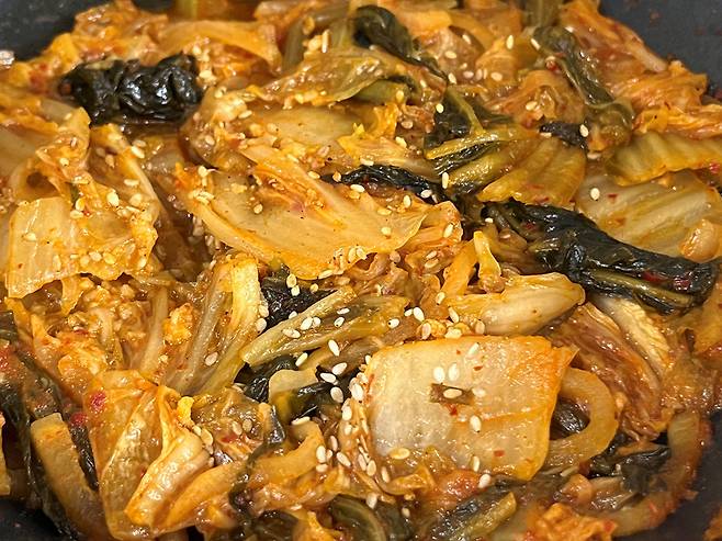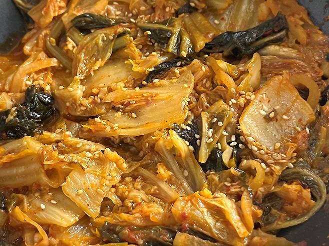 충분히 볶아진 김치에 통깨를 뿌려 주세요. 깨가 더해지면 들기름의 고소함이 한층 살아나면서 신김치 볶음의 맛이 더욱 부드럽게 변하고 고소함도 강화됩니다.