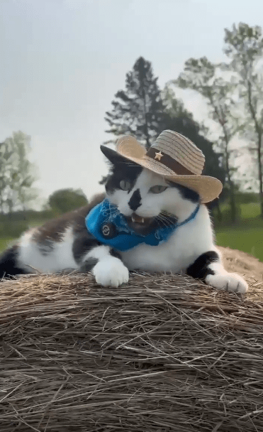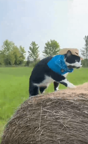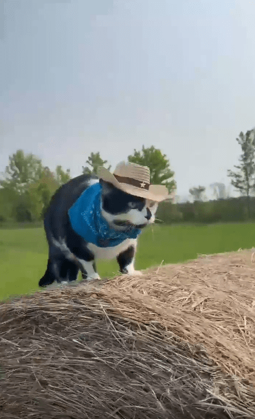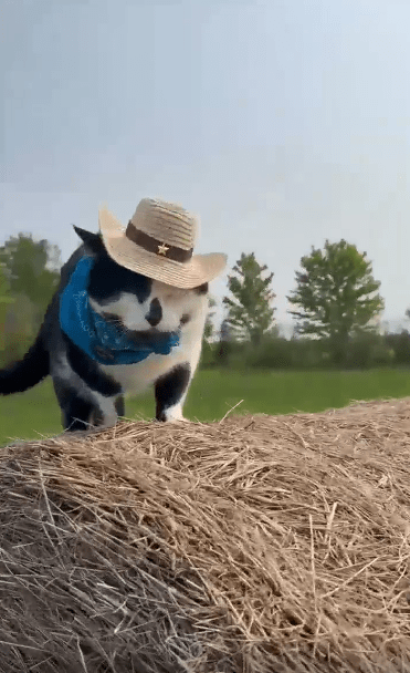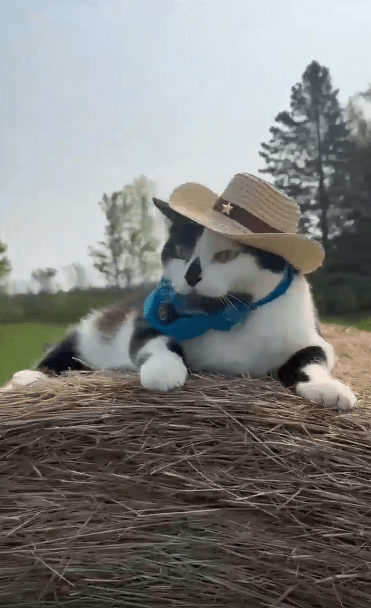 볏짚 위에 당당히 선 모자 쓴 고양이, 그 짧은 순간의 카리스마