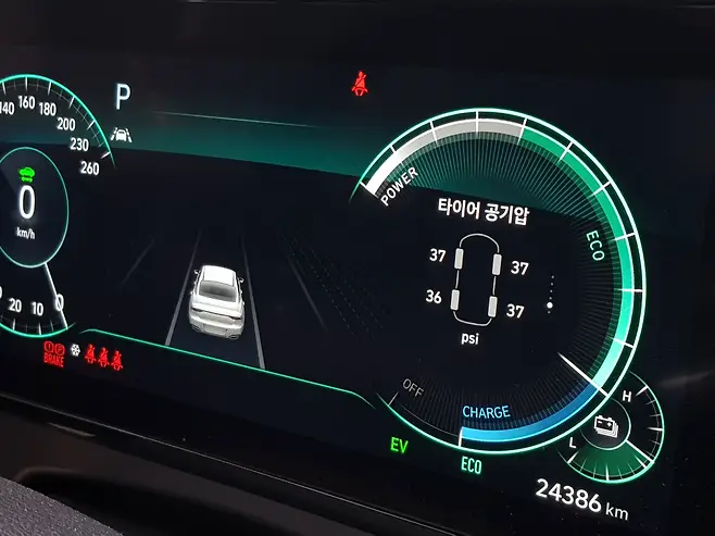 가장 숫자가 큰 kpa는 단위가 5단위입니다. 재미있는 점은 psi로 표시할 때는 좌측 앞뒤 바퀴가 동일한 공기압으로 표시되었지만 kpa 단위로 바꾸니 좌측 뒷바퀴만 공기압이 다른 것으로 표시가 되네요. 앞바퀴가 38psi로 표시되었지만 kpa 단위로 하니 265kpa라고 나오는데, 265kpa를 다시 psi로 변환하면 대략 38.435psi가 됩니다. 따라서 psi 단위에서는 0.5를 기준으로 반올림(또는 반내림)을 하는 것으로 추정됩니다.