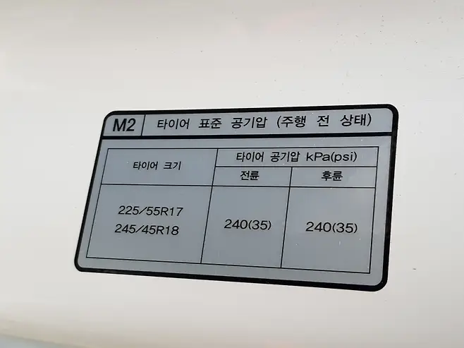 운전석 도어를 열어서 한 번 살펴보면 아래와 같이 해당 차량의 권장 공기압 스티커가 붙어 있을 것 입니다. 그랜저 하이브리드 차량의 경우 17, 18인치 타이어가 있는데 크기와 상관없이 앞뒤 타이어 모두 35psi(240kPa)임을 알 수 있습니다.