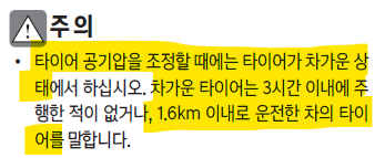 그런데 위의 스티커에 대부분 간과하는 중요한 문구가 있습니다. 바로 [주행 전 상태] 라는 문장입니다. 즉 아래에 발췌한 취급설명서 내용과 같이 이미 어느 정도의 주행을 한 차량의 타이어는 마찰 때문에 뜨거워 지면서 타이어 내부의 공기압이 자연스럽게 올라가게 됩니다. 평균적으로 4~5psi 정도 올라가게 되는데 가장 정확한 방법은 주행 전에 측정을 하는 것이고 그게 어렵다면 타이어 주행 정도에 따라 합리적으로 권장 공기압보다 조금 더 많이 넣는 것이 옳은 방법입니다.