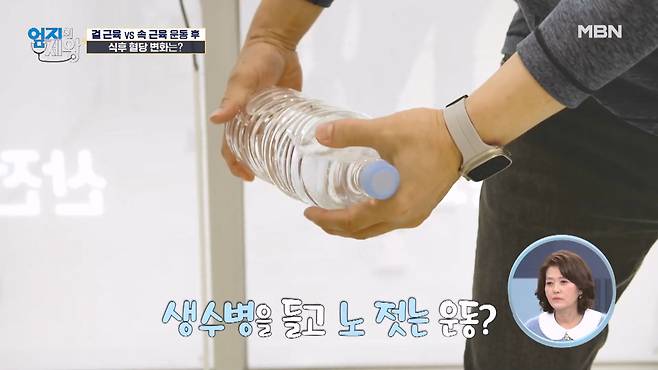 생수병을 들고 허리 밑으로 노 젓듯이 양쪽으로