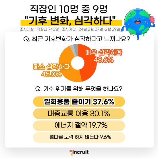 HR테크 기업 인크루트(대표 서미영)가 직장인 743명을 대상으로 기후 변화의 인식에 대한 설문 조사를 실시했다.