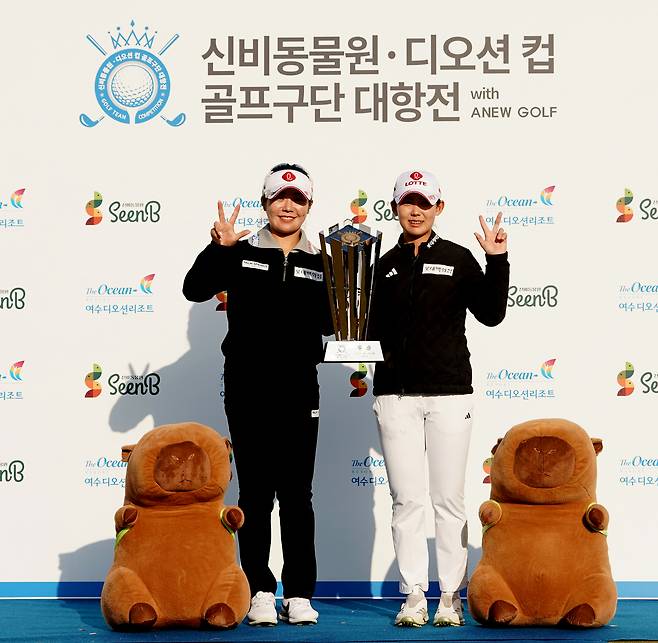 롯데는 23일 전남 여수 디오션 컨트리클럽(파72)에서 열린 신비동물원·디오션컵 골프 구단 대항전 3라운드에서 보기 없이 버디 13개를 합작, 13타를 줄였다. 최종합계 19언더파 197타를 기록한 롯데는 삼천리를 한 타 차로 따돌리고 2023년과 지난해에 이어 3년 연속 우승 트로피를 들어올렸다. 이 대회는 보통 한 팀에서 3명 이상이 출전해 사흘동안 선수를 바꿔가며 경기를 치른다. 하지만 롯데는 3년 내내 황유민과 이소영만 출전해 우승을 일궜다. 우승 상금은 5000만원.