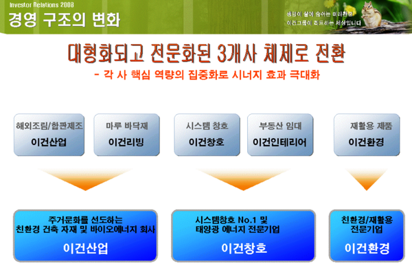 이건그룹은 2008년 이건환경 분할 당시 친환경/재활용 전문 기업으로 회사를 키워가겠다는 비전을 발표했다. 하지만 당시의 약속과 달리 고(故) 박영주 회장의 지분이 아내와 장녀에게 돌아가면서 현재는 사실상의 개인회사로 운영되고 있다.
