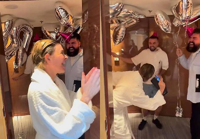 영상에는 호텔 방 문을 열자, 파티 모자를 쓰고 풍선을 든 두 남자와 함께 춤추며 흥에 겨운 리사 린나의 모습이 담겼다.