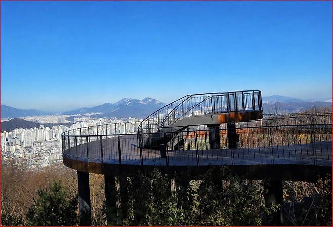 이곳의 하이라이트는 단연 전망대 입니다. 전망대에 오르면 봉화산, 북한산, 도봉산, 수락산까지 이어지는 산줄기와 함께 서울 도심이 한눈에 펼쳐집니다. 특히 맑은 날에는 남산타워까지 또렷하게 보이며, 서울의 지형을 입체적으로 바라볼 수 있는 시야가 열립니다. 이 풍경이 특별한 이유는 단순히 높아서가 아니라, 숲과 도시가 동시에 보이는 위치이기 때문입니다.