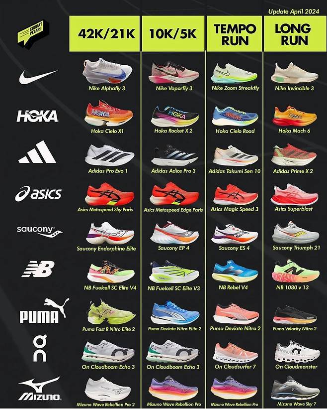 특징: 나이키는 대회용 신발에서 강세를 보이며, 발볼이 좁은 편. 세일과 아울렛 구매 가능.