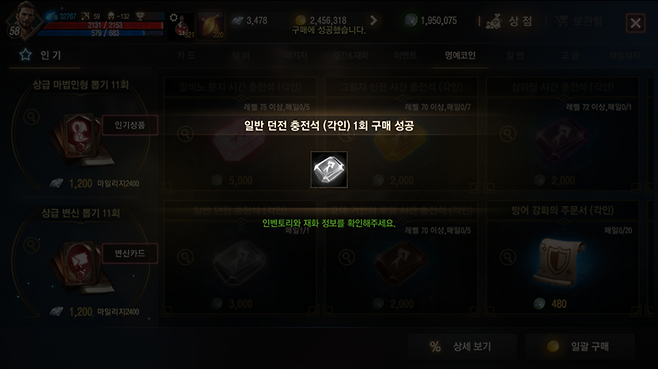신규 서버에선 '던전 충전석'을 구매해야 합니다. 명예 코인을 충전석에 태워? 라고 생각할 수 있겠지만, 사람이 미어터지는 곳을 피해 쾌적하고 한적하게 사냥하려면 불가피합니다. 특히 랭킹 보상을 노린다면 무조건이죠. 남들 다니는 사냥터 똑같이 다니고 레벨업이 느리다고 불평하면 안 됩니다. 최소 70, 최대 80레벨이 될 때까지는 충전석을 적극 활용해야 하여 레벨업에 집중하세요.