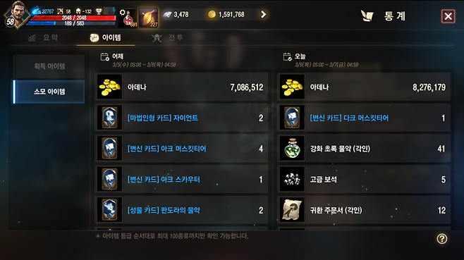 7. 불필요한 아데나 지출을 줄여라! 하루에 고정으로 나갈 지출은 대략 다음과 같습니다. ①혈맹 기부(500,000), ②일반 던전 충전석(300,000), ③버림받은 자들의 땅 충전석(300,000), ④아데나 카드 뽑기(960,000) = 하루에 최소 2,006,000 아데나 이상을 벌어야 적자를 면하게 됩니다.