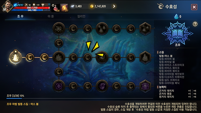 1. 재화 선택에 수호석이 있다면 무조건 선택하라! 조우의 파이어 붐까지 찍고, 아툰으로 넘어가 디크리즈 어택만 해금하여 사용합니다. 이후 파이널 붐 앞 칸에 있는 대미지까지 찍습니다. 판도라의 성장 재화 선택 상자를 구매했다면 수호석을 선택하는 게 좋습니다. 퓨어 엘릭서, 문양 등의 경우 패스 보상의 구조가 생각보다 치밀하게 설계되어 있어 레벨업에 무리가 없을 정도의 스펙 상승이 가능합니다. 하지만 수호성은 확률 해금이라 최대한 많이 시도하여 대미지, 명중을 1이라도 더 챙겨야 합니다.