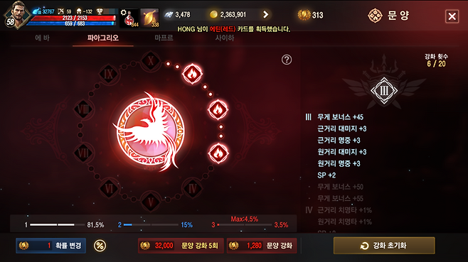 2. 문양은 종류별로 6회 도전하여 9칸 전진을 목표로 삼아라! 6회(5+1)에 강화 횟수 9 / 20을 목표로 삼습니다. 빠른 레벨업을 위해 우선순위는 ①파아그리오, ②사이하, ③마프르, ④에바입니다. 패스 보상 등으로 얻는 상급 신비의 가루 전부 축복의 문양을 제작하여 문양 포인트를 획득하세요. 나중에 명예 코인 모아서 초기화하면 됩니다. 상점의 명예 코인 탭에서 문양 초기화 주문서를 구매할 수 있어요.