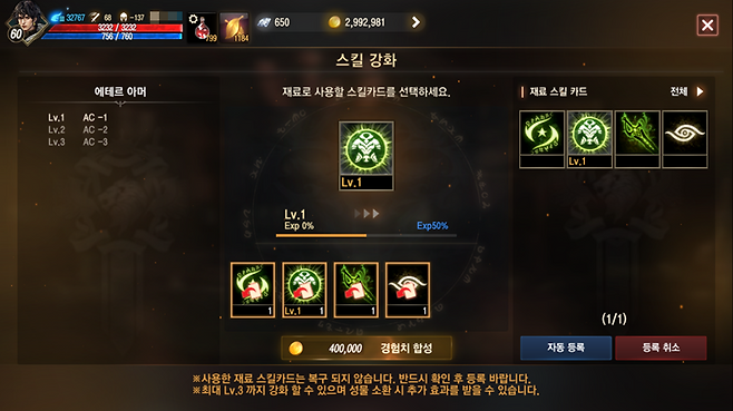 9. 중복 스킬은 레벨업 대신 합성으로! 스킬 레벨업은 아데나 소모가 매우 큽니다. 1회 시도에 1,100,000 아데나가 삭제됩니다.성공해도 눈에 띄가 캐릭터가 강해지는 것도 아니기에 현재 단계에서 고려할 사항이 아닙니다. 스킬 합성을 시도하여 1% 확률로 영웅 스킬을 노리는 게 좋습니다. 뜨면 대박이니까요.