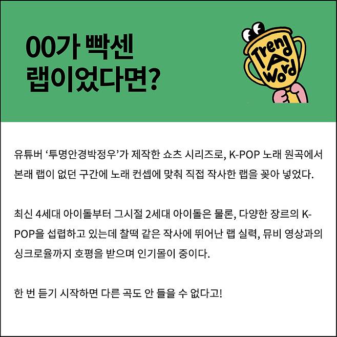 유튜버 ‘투명안경박정우’의 ‘00가 빡센 랩이었다면?’ 시리즈!빠르게 들어가 보자.