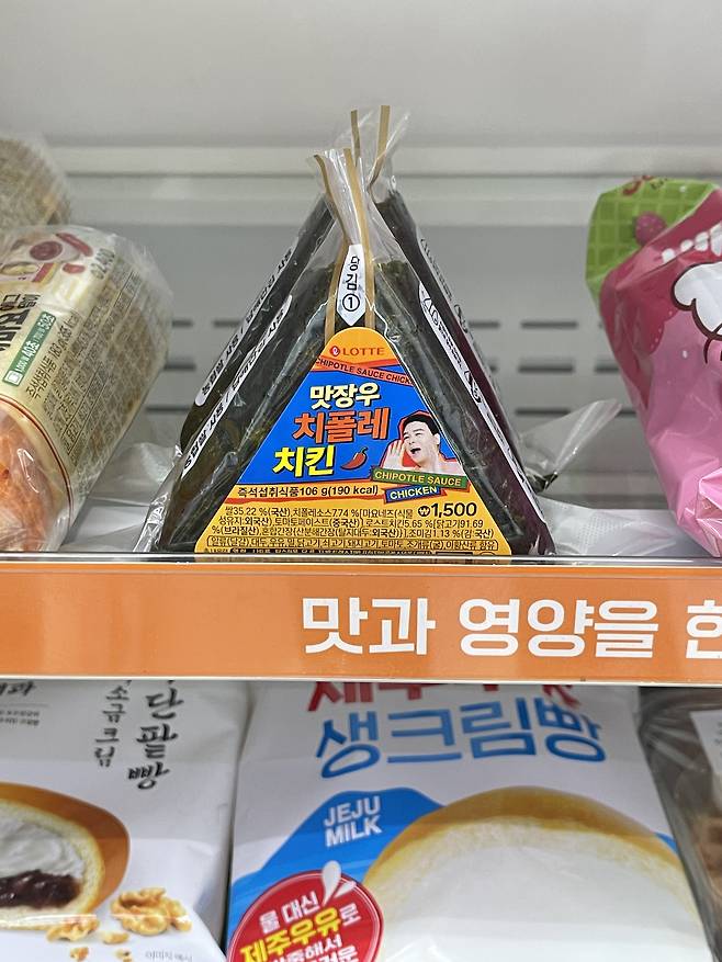 오븐에 구워 더 맛있는 치폴레 치킨 토핑이 올라가있는 삼각김밥이에요.