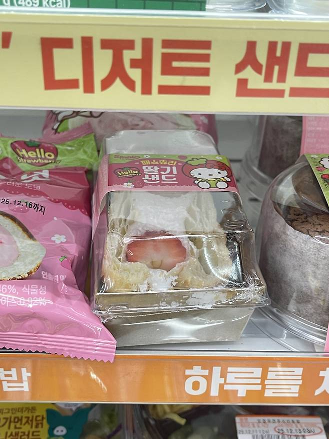 헬로키티 콜라보 딸기 페어 신상 디저트로, 상큼한 딸기 맛과 귀여운 산리오 패키지가 매력적인 편의점 간식이에요.