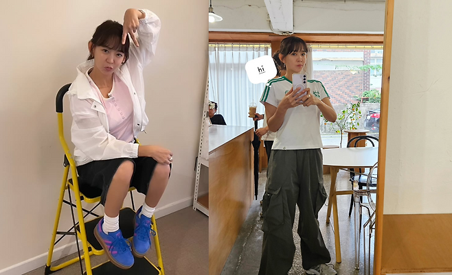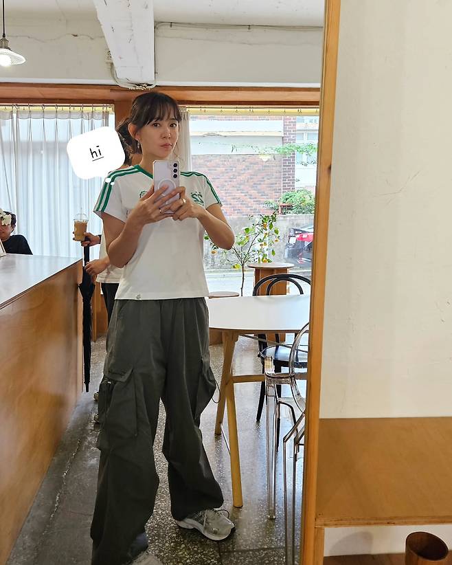 카페에서 포착된 심이영은 화이트 베이스의 스포츠 저지에 카키색 와이드 카고 팬츠를 매치하여 편안하면서도 트렌디한 룩을 연출하고 있다. 저지의 그린 라인 디테일이 포인트로 작용하며, 루즈한 실루엣의 카고 팬츠는 활동성과 스타일을 동시에 잡은 선택이다.