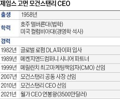 금융위기를 진화할 소방수로 CEO에 선임된 그는 지금껏 13년째 모건스탠리를 이끌고 있다. 실적만 두고 임기를 결정하는 월가에선 이례적인 일이다. 러셀3000에 편입된 금융기업 CEO의 임기는 2017년 약 15년이었지만 2020년 7년으로 반토막 났다.