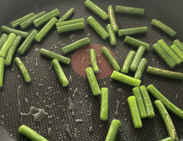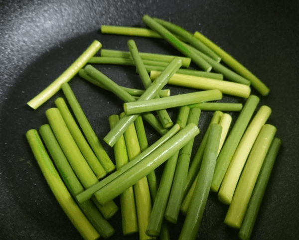 팬에 들기름을 두르고 마늘쫑을 1분 정도만 볶는다. 이때 과하게 볶으면 질겨진다. 마늘쫑은 숨이 살짝 죽을 정도가 적당하다. 처음부터 센 불을 쓰지 말고 중불에서 빠르게 향만 입힌다는 느낌으로 접근하는 것이 좋다.