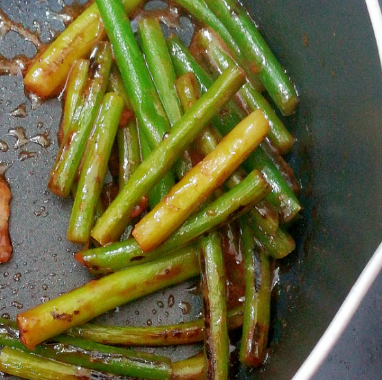 양념이 자작하게 줄어들면서 마늘쫑에 간이 배어든다. 물을 함께 넣는 이유는 간장이 바로 타지 않게 하기 위함이다. 단맛이 과하지 않도록 올리고당은 최소량만 사용한다.