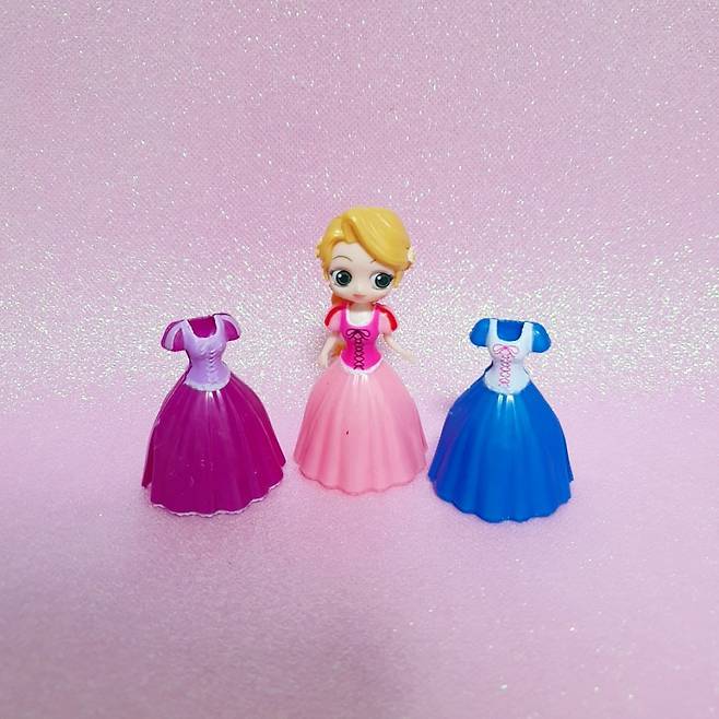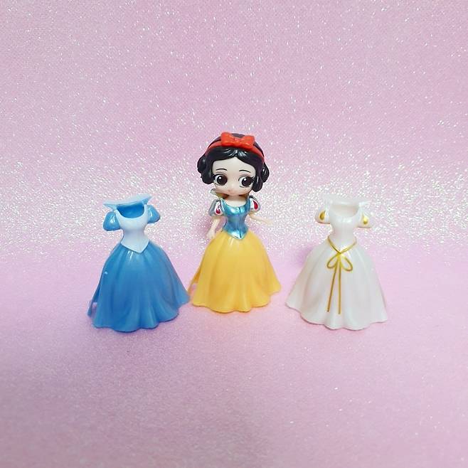 첫 번째는 백설공주 인형이에요. 사진처럼 갈아입을 수 있는 옷이 한벌 더 들어있답니다. (총 두벌)