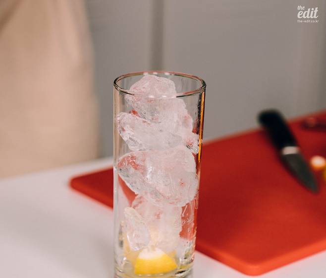 1. 먼저 하이볼 글라스에 얼음을 가득 채워준다. 너무 작은 얼음이면 액체가 닿았을 때 금방 녹으니 조금 큼지막한 녀석들로 골라주면 좋다.