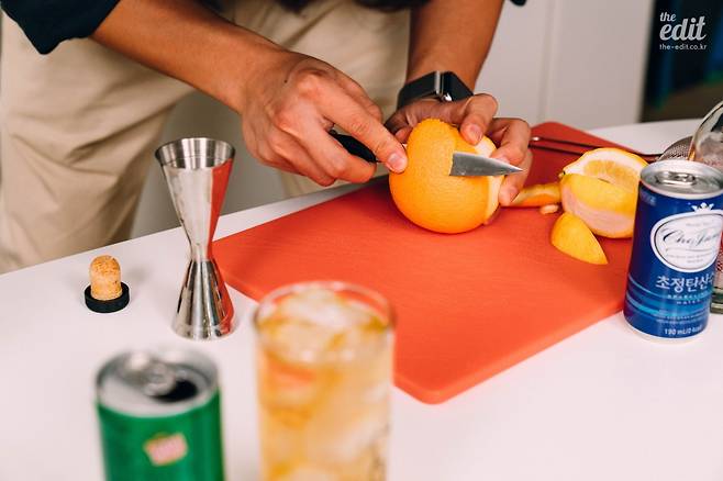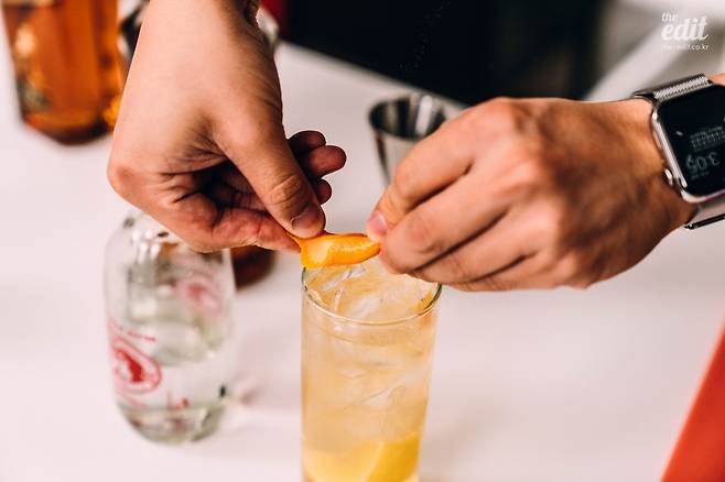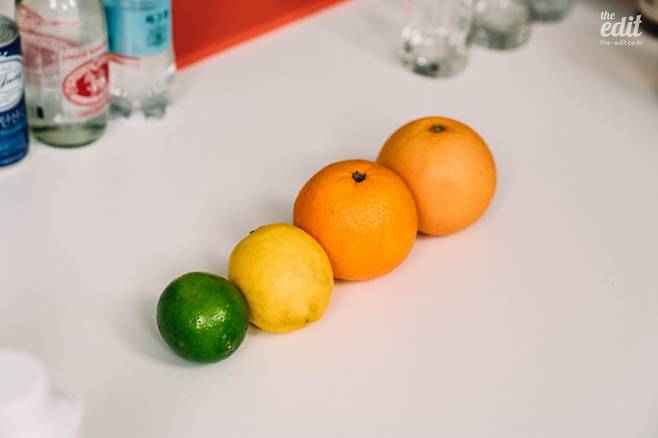 어떤 방식으로 넣을 것인가도 중요한데, 웨지(Wedge) 형태로 잘라 즙까지 짜서 넣는다면 맛에 가장 큰 영향을 주고, 슬라이스(Slice) 형태로 잘라 살짝 담가 놓는다면 과육이 하이볼에 자연스럽게 녹아 나와 과하지 않은 선에서 풍미를 첨가할 수 있다. 껍질을 얇게 자른, 필(Peel) 형태로 만들어 오일을 살짝 뿌려주고 얼음 위에 가볍게 넣어준다면 맛은 크게 바꾸지 않으면서 향을 더욱 풍부하게 만들 수 있다.