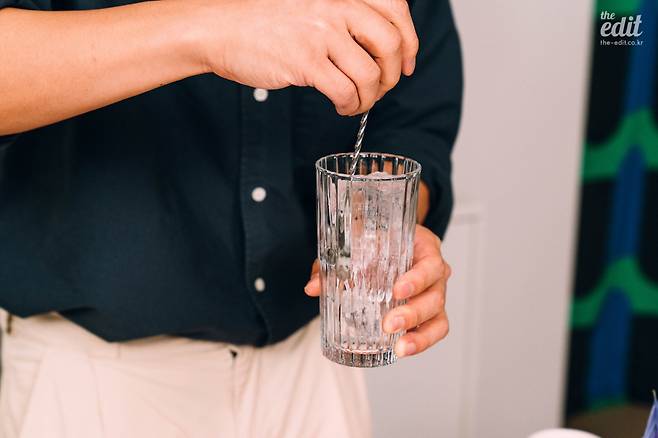 3. 술을 넣고 얼음과 함께 전체적으로 저어준다. 이때 바 스푼(Bar Spoon)이라고 불리는 기다란 칵테일 전용 숟가락을 이용하면 좋지만, 만약 없다면 젓가락 등 다른 걸 써도 무방하다. 이렇게 술을 넣고 얼음을 저어주다 보면 가득 채워져 있던 얼음의 높이가 조금 낮아진다. 얼음이 녹으면서 사이 빈 공간이 더 촘촘하게 메워지기 때문이다. 그럼 얼음의 높이가 내려간 만큼 새로운 얼음을 다시 채워준다.