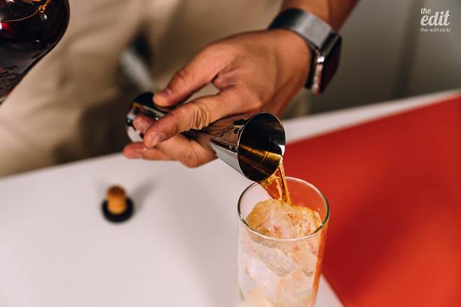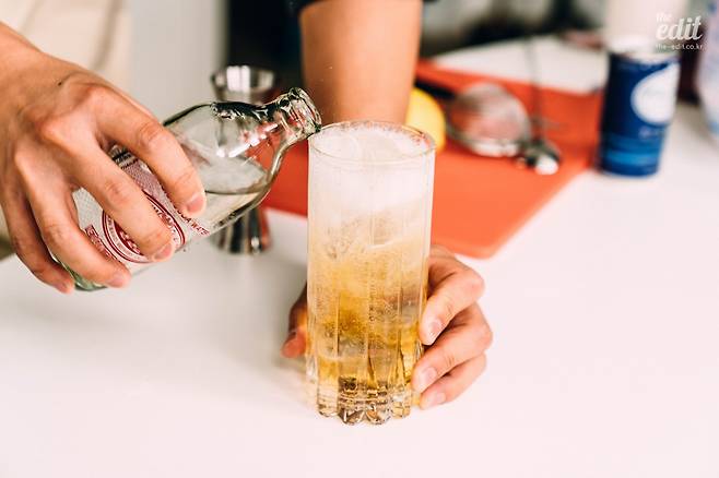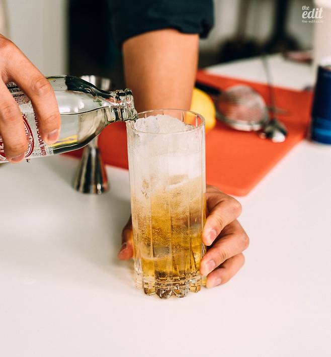 4. 술을 넣고 얼음을 다시 잔 가득 채웠다면, 이제 탄산음료를 넣어줄 차례다. 이때 얼음을 최대한 피해 따라주는 것이 중요하다. 탄산음료를 얼음에 직접 부으면 거품이 잔뜩 일어나고 탄산 가스가 많이 빠져나가 밍밍한 하이볼이 되고 만다. 따라서 잔을 살짝 기울이거나 바 스푼으로 얼음을 한쪽으로 잡아주어 얼음과의 접촉을 최대한 피하며 음료를 부어주는 것이 좋다. 음료를 잔 끝까지 채워주고 나서는 바 스푼으로 가볍게 몇 번 더 섞어준다.