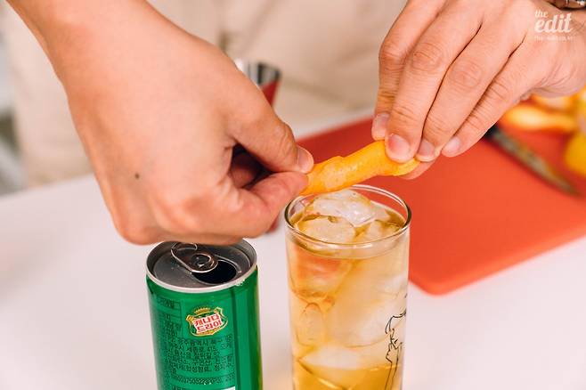 5. 이렇게 마무리를 할 수도 있지만 좀 더 색다른 풍미를 원한다면 가니쉬를 하자. 레몬, 라임 등의 껍질을 얇게 벗겨 두 손으로 잡고 뿌려주면 껍질에 있던 오일이 스프레이처럼 뿜어져 나오는데, 이걸 얼음 위에 뿌려주면 하이볼에 상큼하고 신선한 향을 더할 수 있다. 맛에 직접 상큼함을 더하고 싶다면 웨지 형태로 자른 과육을 짜서 넣어보자. 레몬을 ⅙ 정도 크기의 웨지 모양으로 자르고 즙을 내면 5~7mL 정도 나오는데, 이렇게 즙을 짜고 남은 과육도 그대로 넣어주면 좋다. 웨지 형태의 가니쉬는 얼음을 넣기 전에 먼저 넣기를 추천한다. 마지막에 넣으면 마실 때마다 큼지막한 과육이 입에 닿아 식감이 좋지 않을 수 있다.