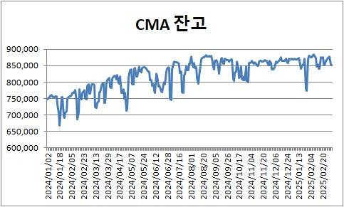 한국은행이 지난해 10월 3년 2개월 만에 통화 완화 기조로 정책을 전환하며 본격적인 금리 인하 사이클에 진입한 뒤로 CMA는 공모주 청약 같은 이벤트를 제외하면 큰 등락 없이 잔고가 유지되는 모습이다.