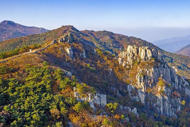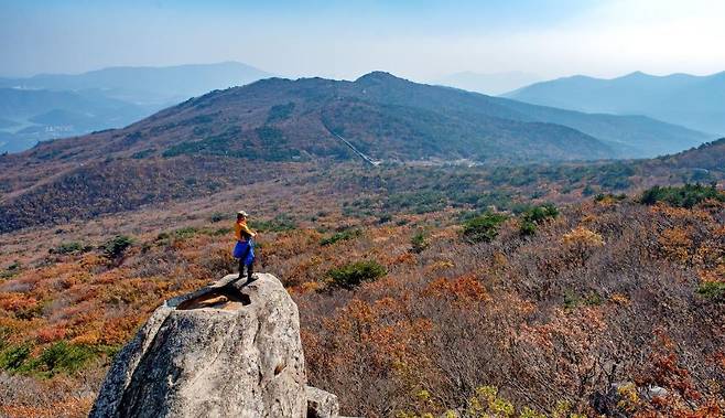 가파른 초반부를 지나 북문에서 고당봉으로 향하는 성곽길은 금정산 단풍산행의 하이라이트죠. 특히 고당봉 정상에 서면 부산 도심과 사방으로 펼쳐진 울긋불긋한 금정산 단풍 파노라마, 저 멀리 대마도가 장대하게 펼쳐진다.
