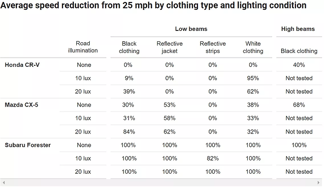 IIHS의 수석 연구원 데이비드 키드(David Kidd)는 “반사 띠의 위치와 움직임이 운전자로 하여금 보행자의 움직임을 빠르게 인식할 수 있게 돕는다, 하지만 보행자 AEB 시스템은 이러한 움직임을 효과적으로 인식하지 못하고, 오히려 혼란을 일으킬 수 있다”라고 설명했다.