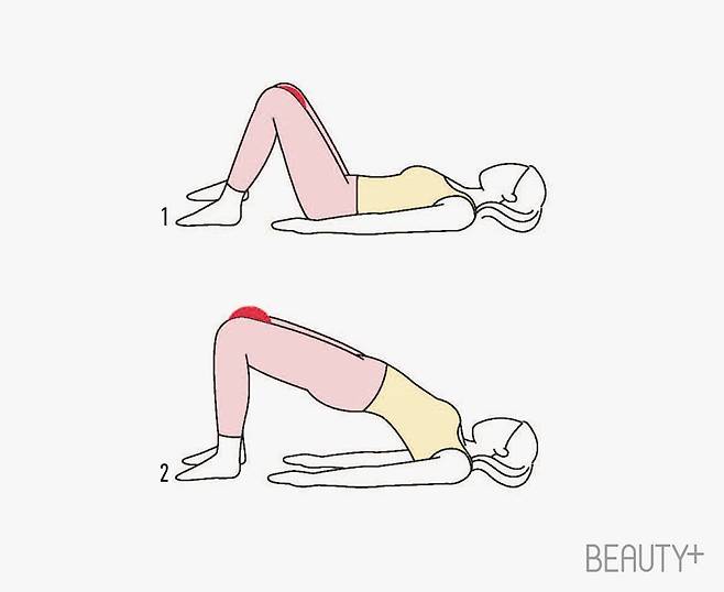 2 어깨부터 무릎까지 일직선이 되도록 엉덩이를 천천히 들어 올렸다가 2~3초 유지 후 다시 천천히 내려온다. 15회씩 3세트 진행.