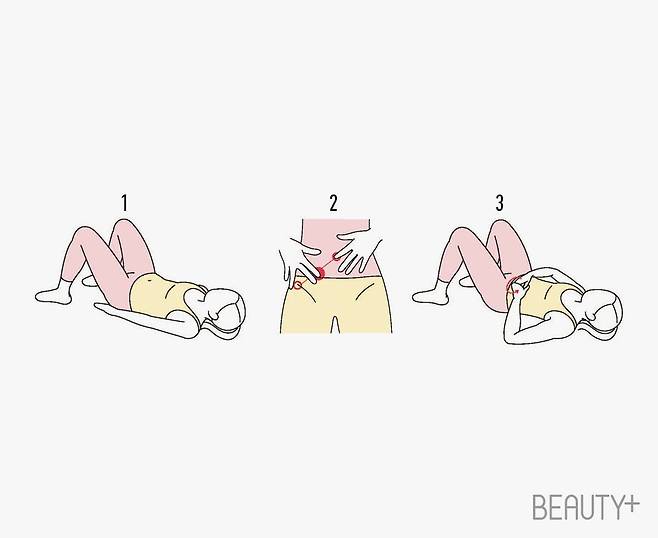 2 오른손은 골반뼈에, 왼손은 배꼽에 두고 가상의 선을 그으며 가운데 부분을 찾는다. 3 찾은 부위를 손끝으로 천천히 깊숙하게 압박하며 마사지한다. 이때 아픈 부위는 천천히 호흡하며 원을 그리듯 부드럽게 마사지할 것. 반대쪽도 동일한 방법으로 시행한다.