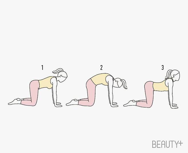 2 숨을 내쉬며 등을 둥글게 말아 고양이(Cat) 자세를 취한다. 이때 턱을 가슴 쪽으로 당겨 목도 이완한다. 3 반대로 소(Cow) 자세로 돌아올 차례. 숨을 들이마시며 등을 부드럽게 펴고 가슴을 열어 올린다. 엉덩이를 들어 올리고 시선을 천장 방향으로 향한다.