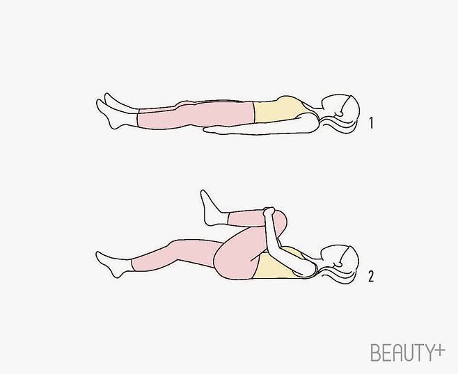 1 바닥에 똑바로 눕는다. 두 다리를 쭉 뻗고 손은 엉덩이 옆에 편하게 둔다.